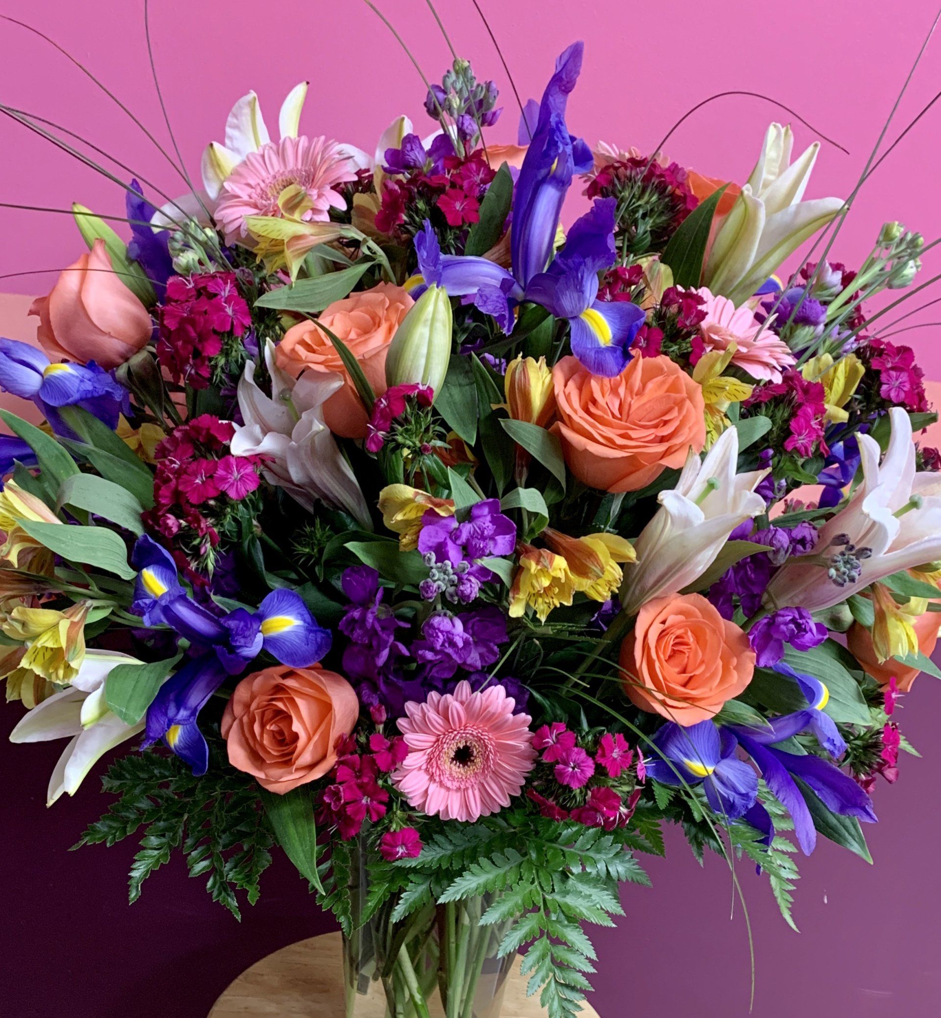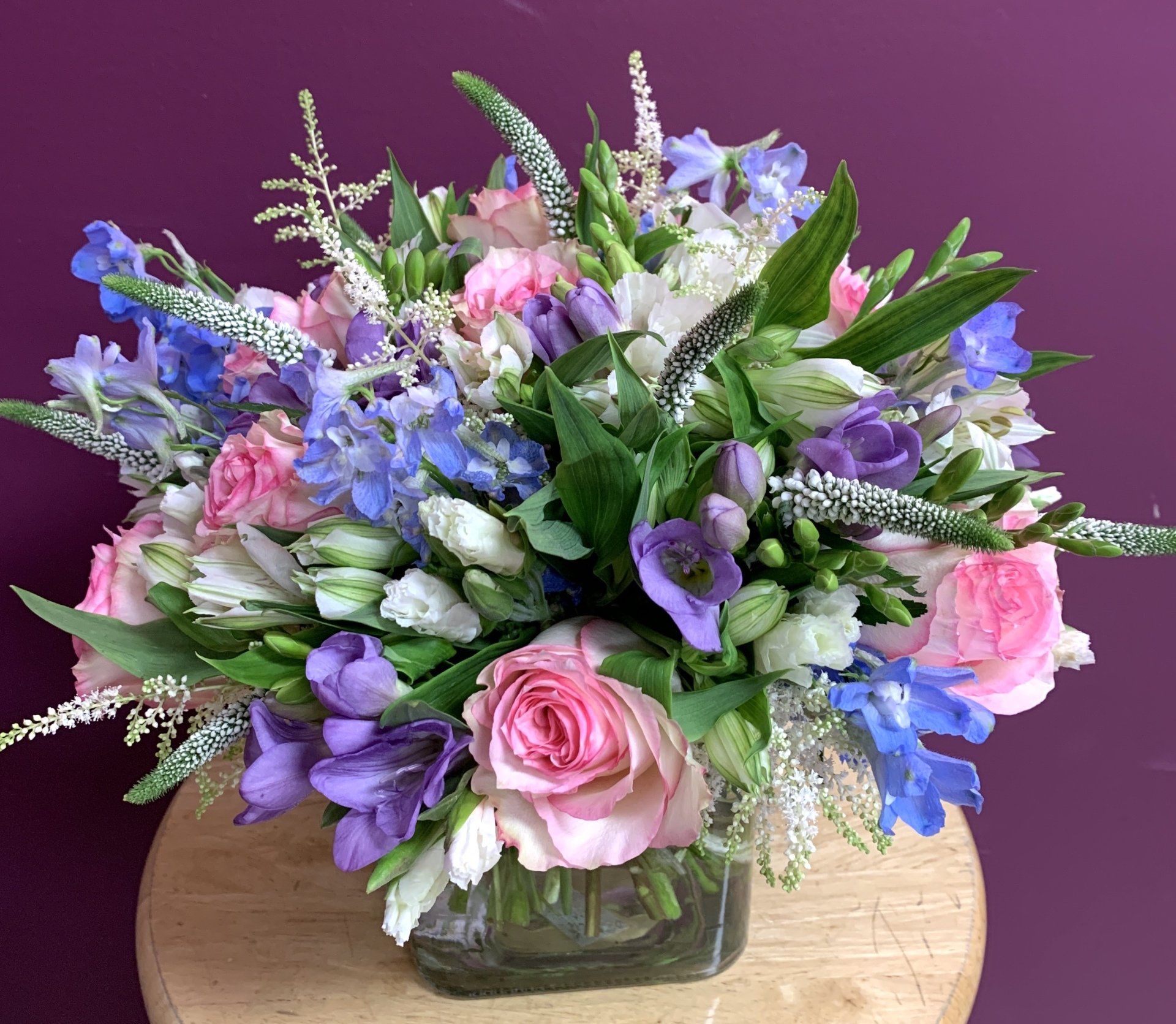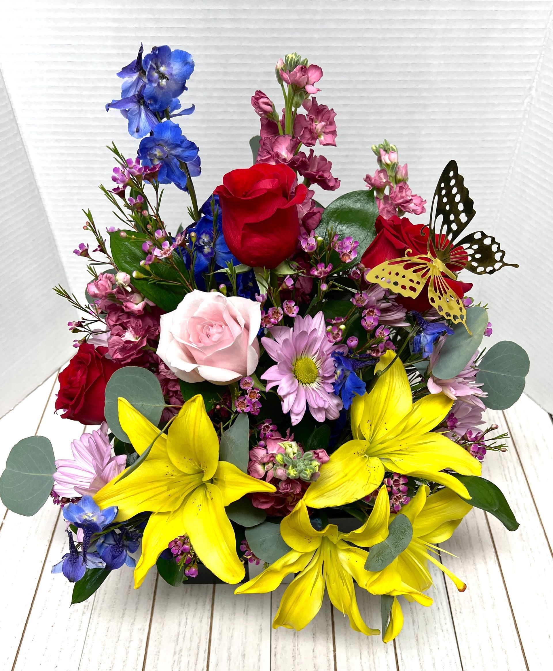 All of our arrangements are custom made for each individual order. Our photo gallery demonstrates our style and variety. Starting price is $50.00 for an arrangement in a 5x5 glass cube or a tall vase measuring 8" in height. We also offer larger arrangements to accommodate larger budgets.